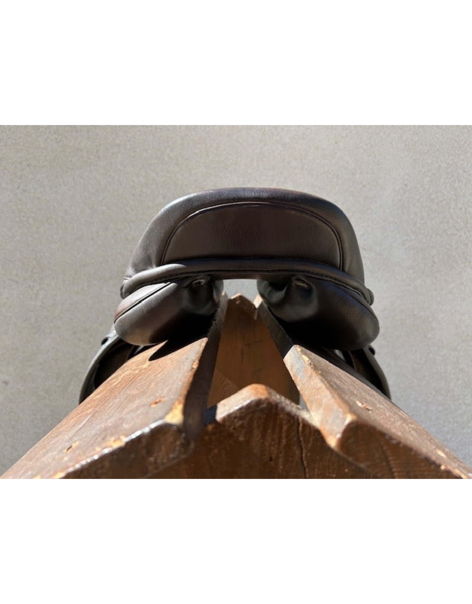 This pony saddle has a load of great features! It has velcro knee and calf blocks, padded skirts, wool flocked panels, a nice wide channel, reinforced bottom flap edge, and has an exchangeable gullet system! The gullet is currently measuring 5". There are a few cosmetic flaws on the saddle- some wear at the bottom edge of the flap and a scratch on the pommel. Comes with a Royal Heritage saddle cover.